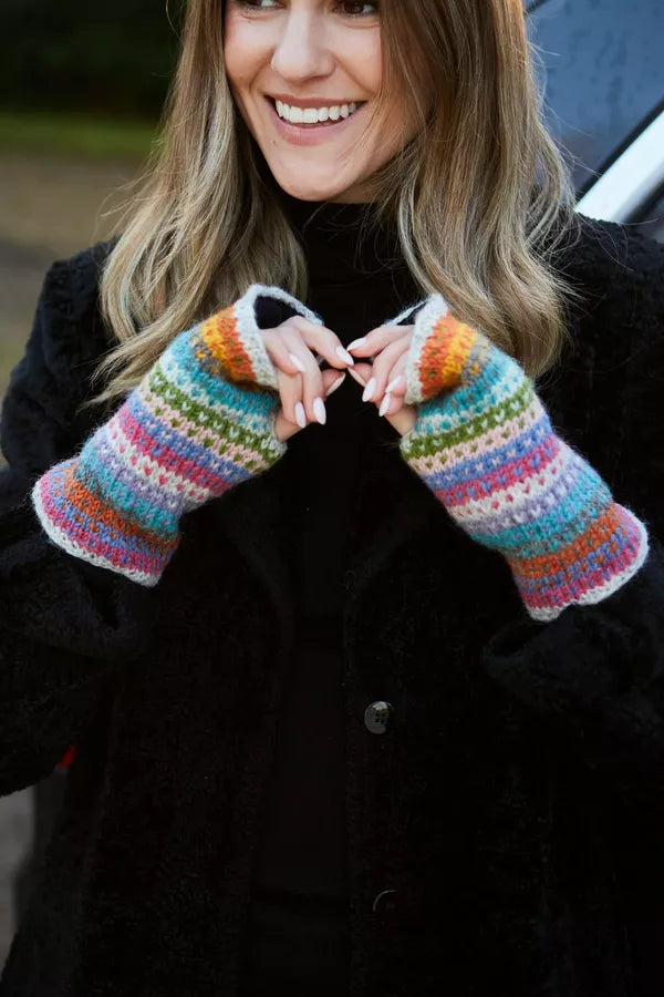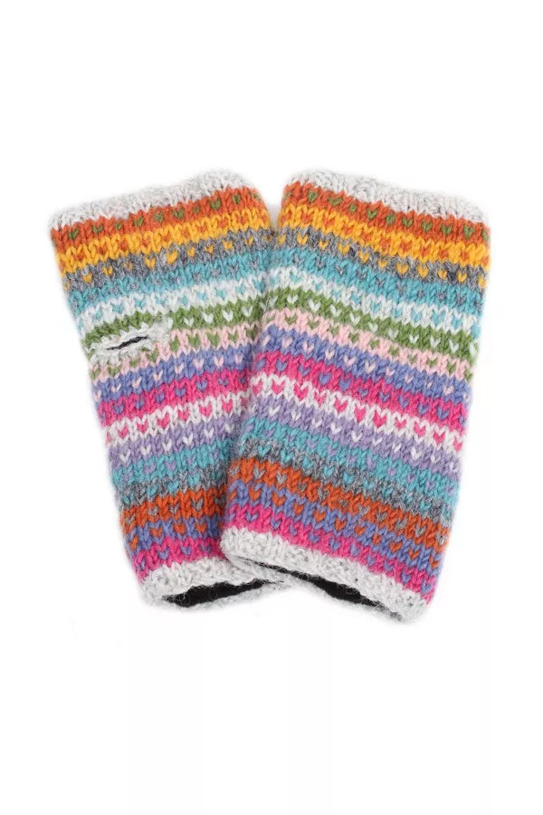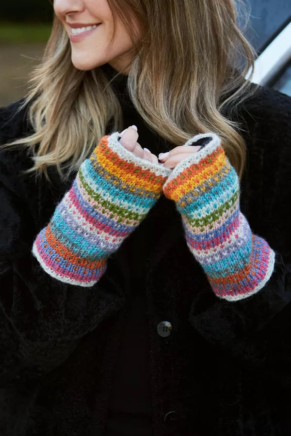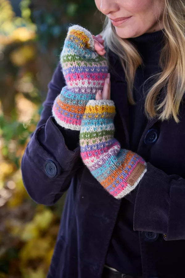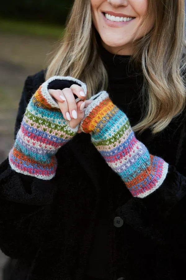 Beautifully knitted brightly coloured dotty stripes. Pachamama handwarmers are cosy and keep your fingers free.