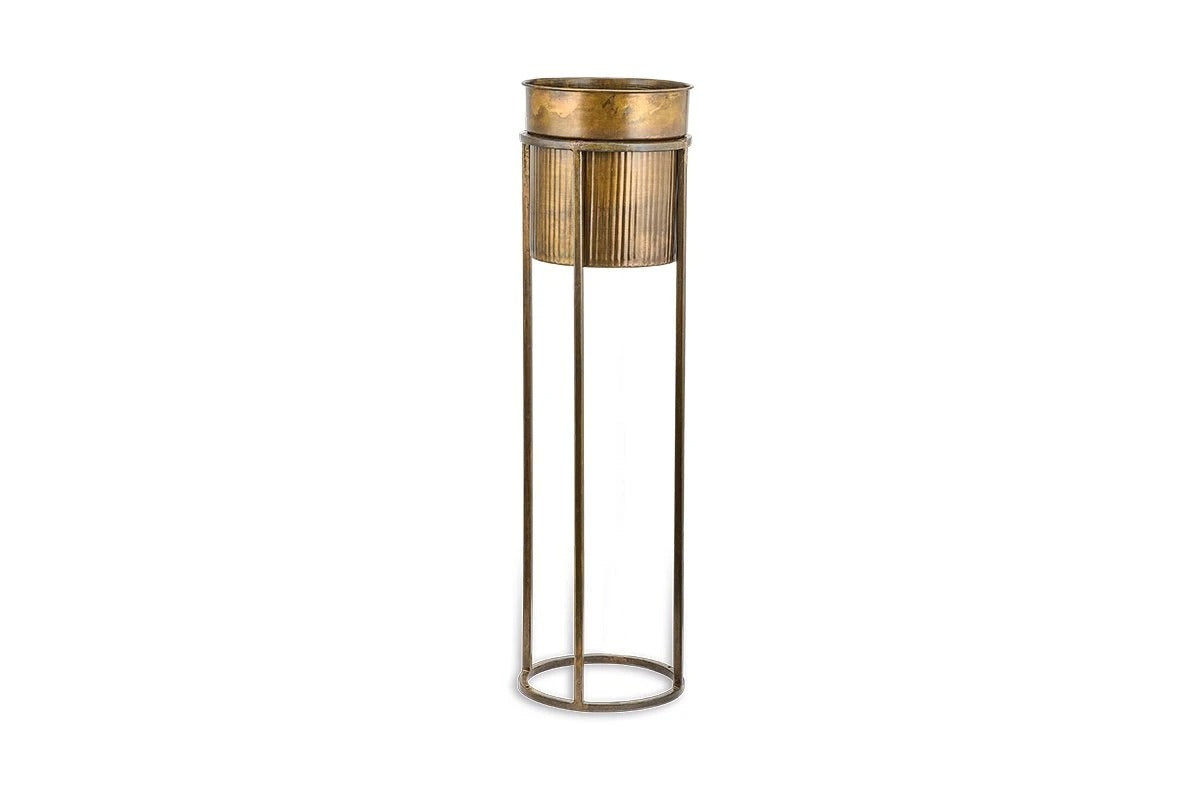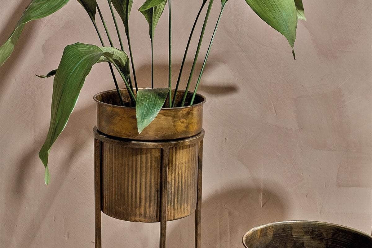 The Kadassa standing planter takes indoor gardening to new heights. This striking collection of planters have an aged antique brass patina that provides an individual aesthetic and sophisticated backdrop for house plants. The sturdy stand has a round base and top, where the planter neatly slots into the stand. The planter itself has an interesting ribbed design that is topped with a smooth elegant edge.