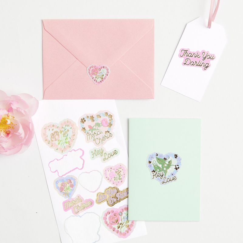 Paper stickers in heart and rose designs add a special charm to craft projects.