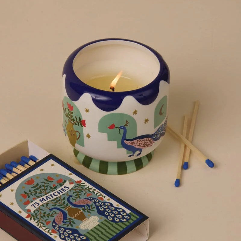 8 oz ceramic candles with hand-painted details have been filled with bold fragrances to match the imaginative design and ignite your senses.
