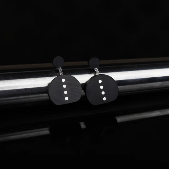 These light and dainty earrings are made with a combination of natural and ebonised yew wood, inlaid with tiny pieces of sterling silver and hung with sterling silver box chain for a tiny bit of sparkle. They are extremely lightweight weighing less than 1g each, and measure 1.7cm x 2.6cm.