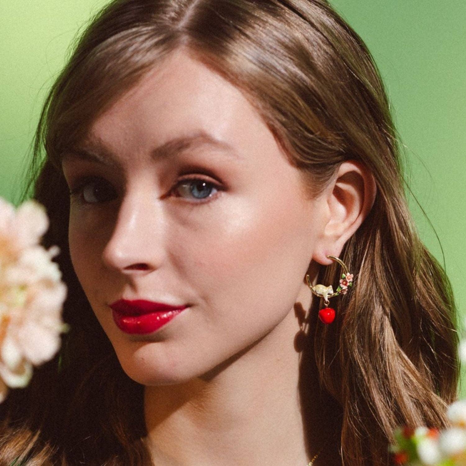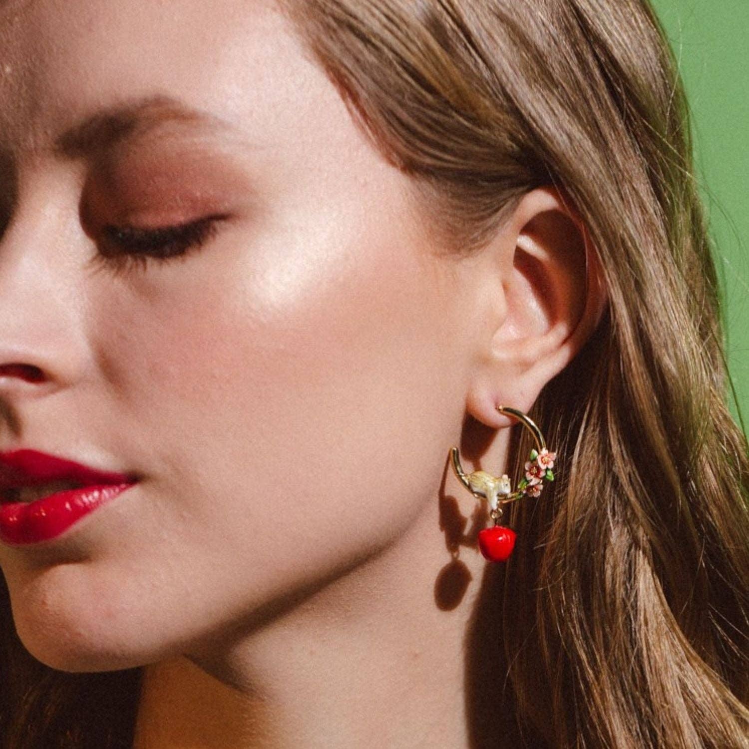 Apple Blossom & Mouse Hoop Earrings. Embrace the playful charm of nature with these captivating hoop earrings, another beautiful mouse creation from Bill Skinner Studio. Each earring features a delicate apple blossom, its petals painted in soft hues and accented with a touch of sparkle. A curious little mouse peeks out from within the hoop, adding a touch of whimsical charm to this enchanting design. A juicy red apple dangles playfully below. The hoop design adds a touch of modern elegance, making these earrings a perfect blend of classic and contemporary style.