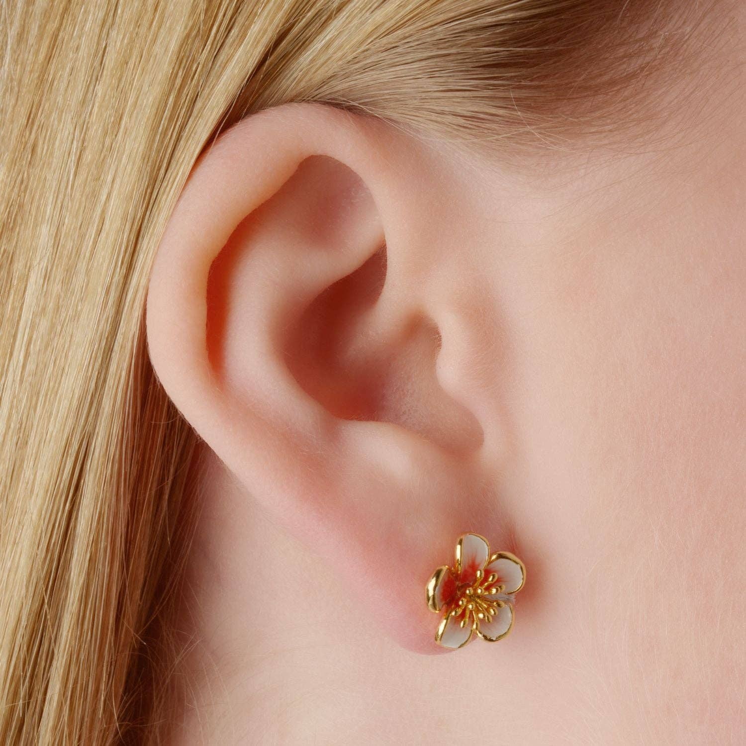 Delicate Apple Blossom Stud Earrings. Delicate apple blossom, its petals painted in soft hues and accented with a touch of sparkle.