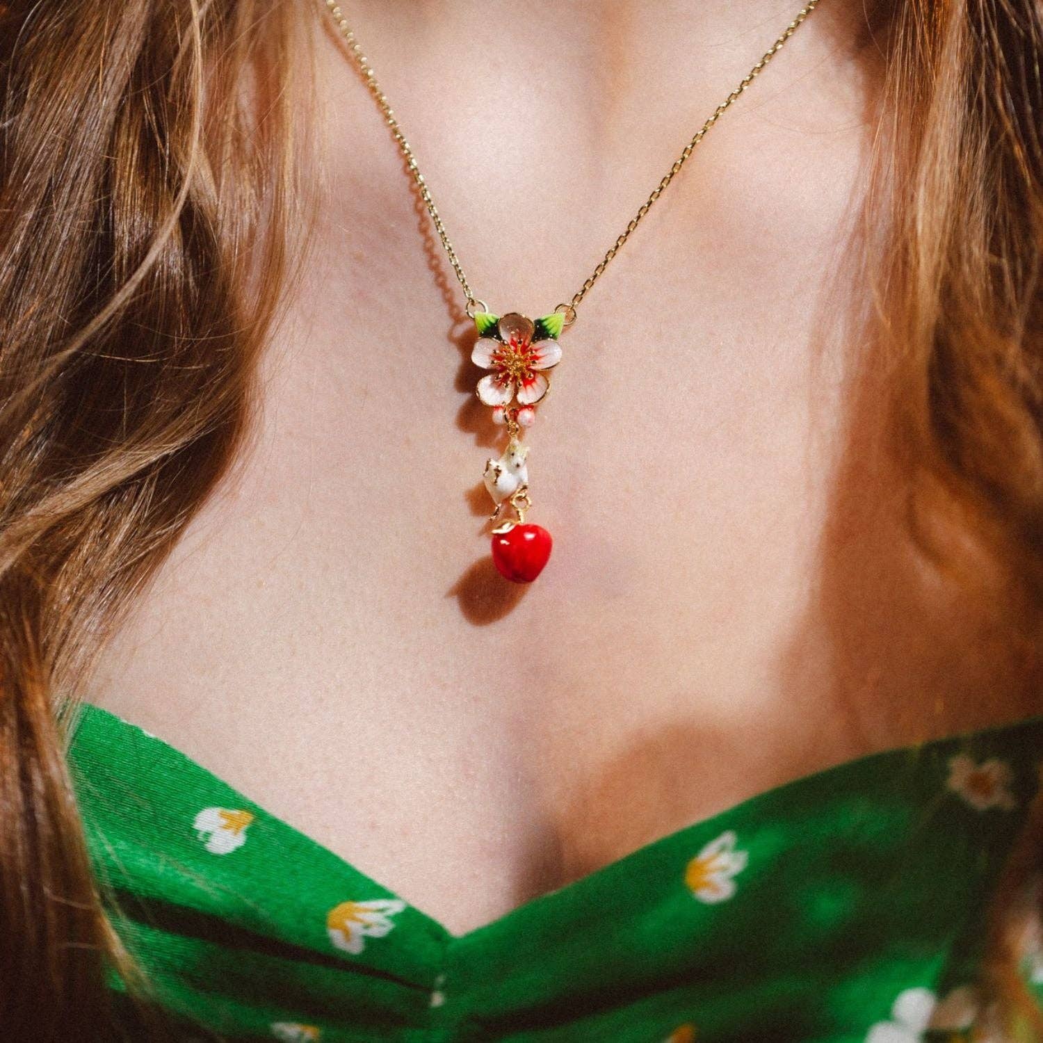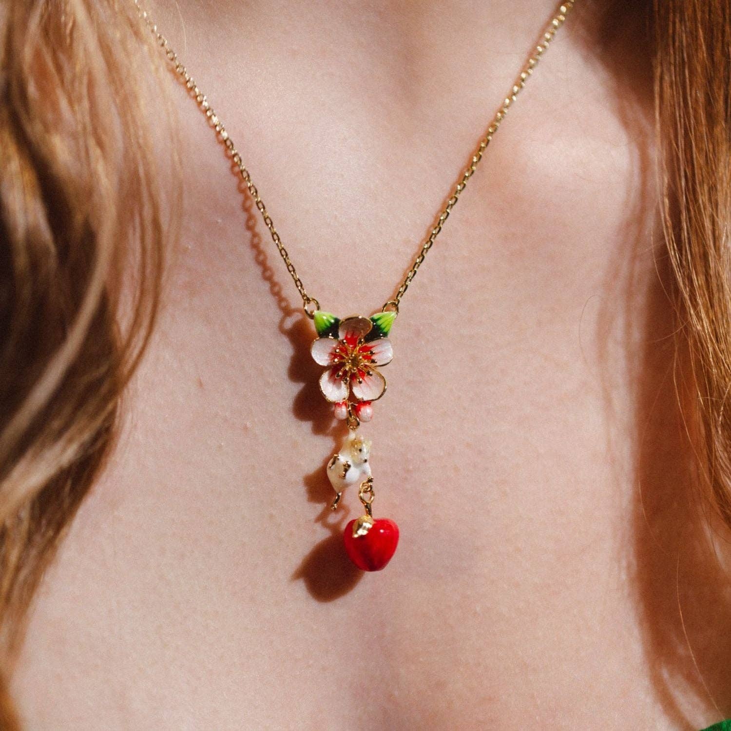 This necklace isn't just a piece of jewellery; it's a wearable story, a touch of nature's playful magic, and a conversation starter that's sure to bring a smile. Whether you're drawn to its whimsical charm, captivated by its intricate details, or simply seeking a piece that exudes both sweetness and style, this apple blossom and mouse pendant necklace will add a touch of wonder to your collection.