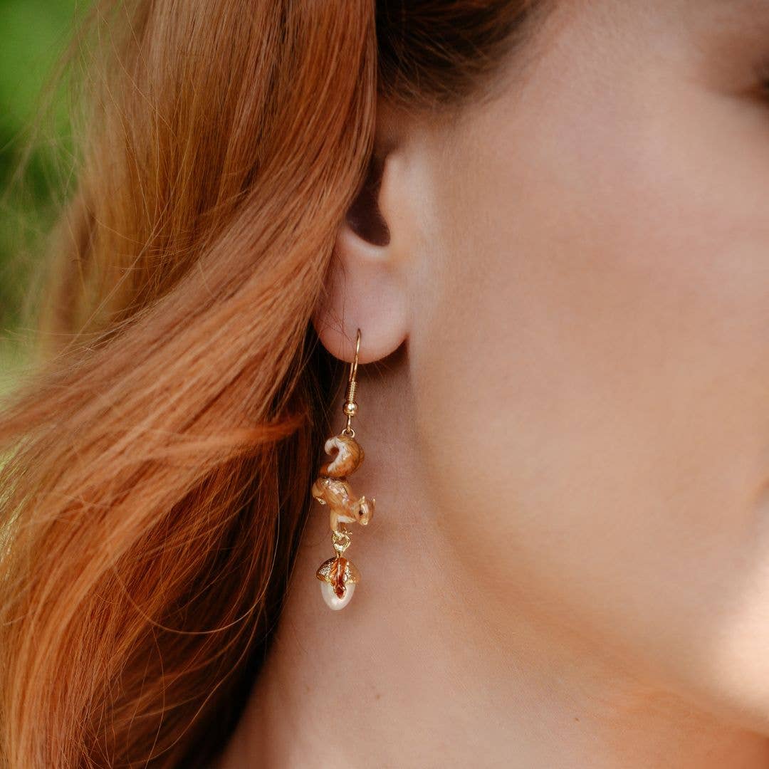 These drop earrings are full of charm and character, featuring a hand painted red squirrel, and pearlized acorn drops, suspended from an elegant 18ct gold fishhook. Style with matching items from Bills Autum Days Collection. An ideal gift for that special occasion. "