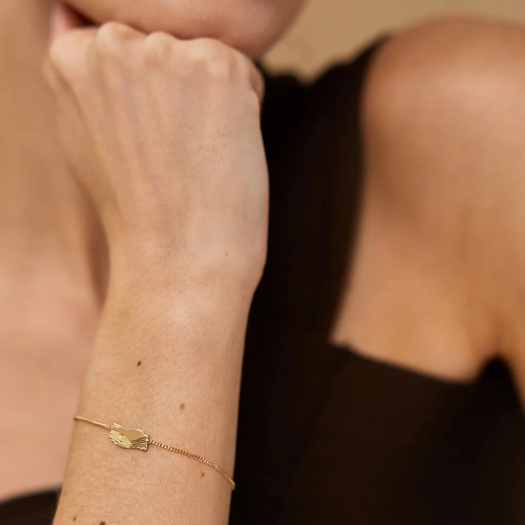 A delicate bracelet with an asymmetrical pattern representing the warp threads of a weave. Its engraved and striated surface makes the light sparkle. With its pure, minimalist shape, this delicate bracelet with its unique pattern can be worn every day and can be mixed and matched with others.