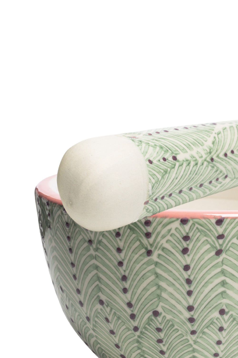 This hand-stamped stoneware set brings fresh patterns to your kitchen. The mortar and pestle, along with its matching handmade pestle, help you grind and prepare pestos, spices, and nuts. The pestle's handcrafted charm is evident in the design.