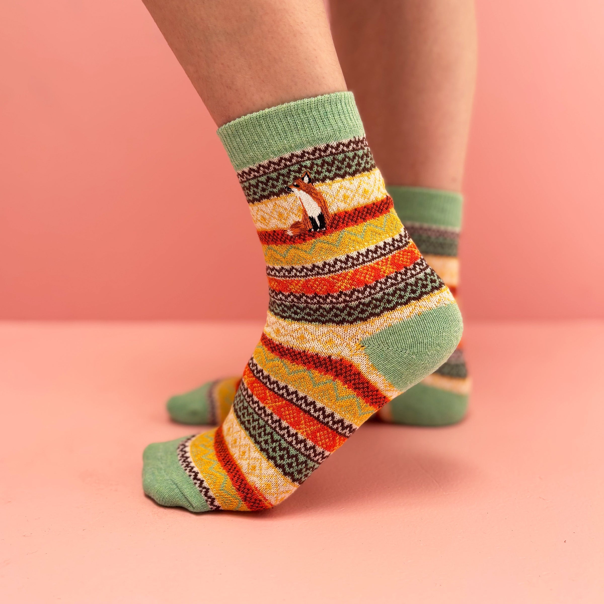 Celebrate woodland charm with these Secret Garden Fair Isle socks, featuring a playful fox embroidered on the ankle. Woven in a classic Fair Isle pattern with warm shades of green, orange, brown, and beige, they offer comforting warmth and a dash of autumnal magic. Perfect for brightening chilly days, whether you’re curled up at home or strolling through the crisp outdoors.