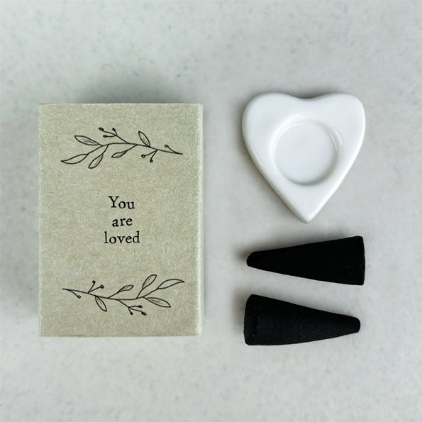 Minimalist ceramic incense holder and two geranium, orange and lavender incense cones in a decorated matchbox.