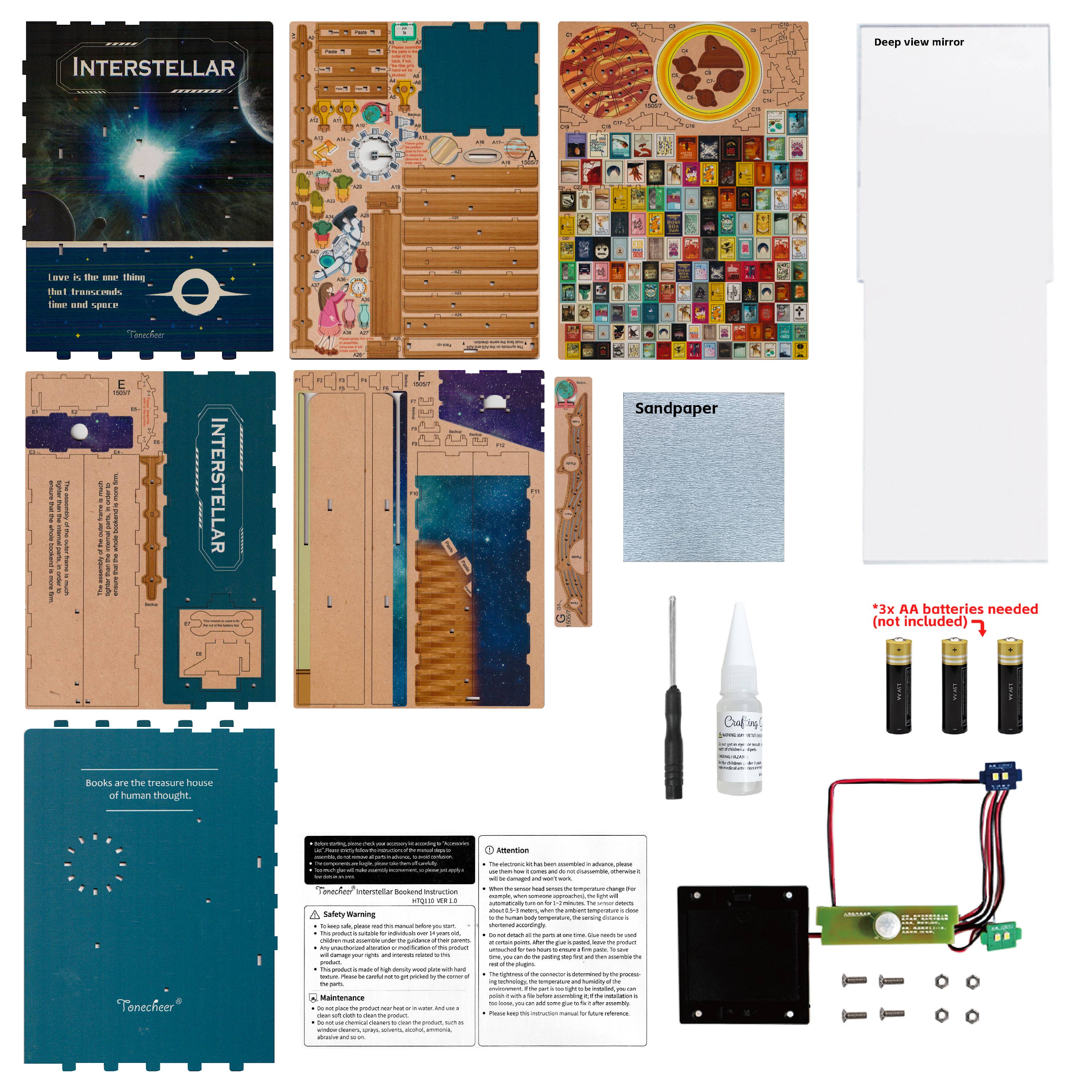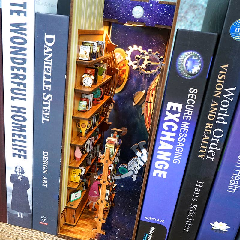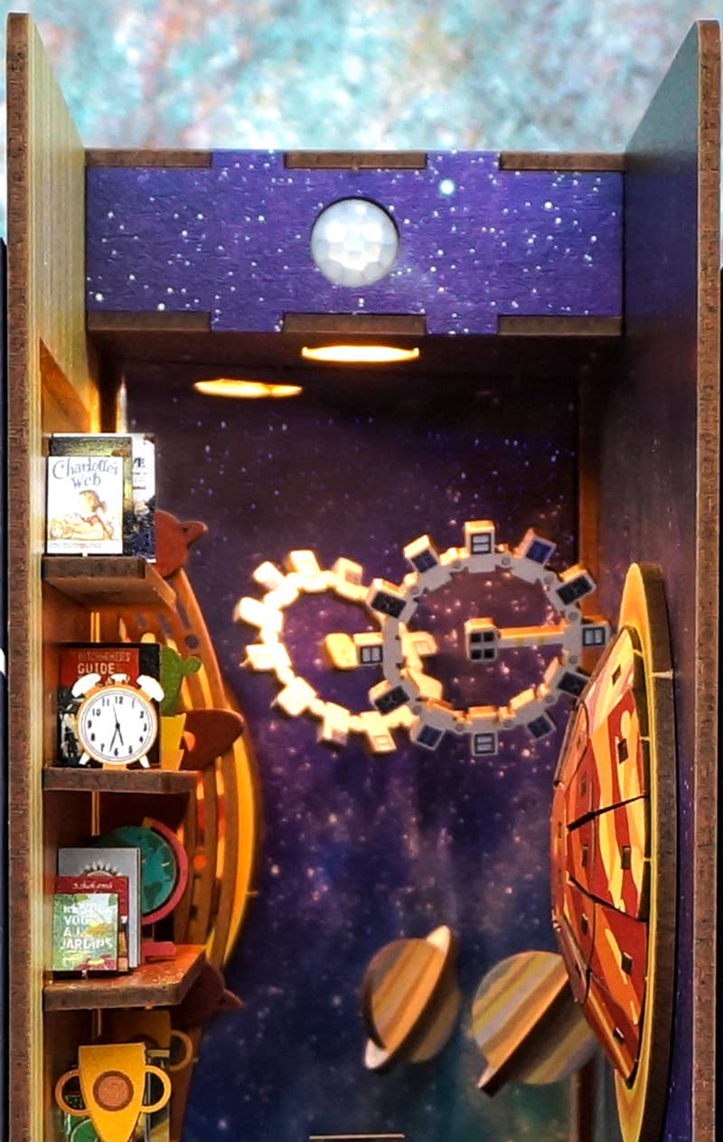 This exquisitely designed interstellar-themed book-nook kit mesmerizes with a captivating spectrum of colors, each reminiscent of distant galaxies and cosmic wonders. Its construction is a testament to both artistry and engineering, with a thickness and sturdiness that evoke the rugged beauty of celestial bodies. Assembling this extraordinary piece is a voyage of discovery, where each step reveals a new facet of its ingenuity and craftsmanship. Moreover, it seamlessly integrates advanced interstellar-inspired motion-sensing technology, allowing for an interactive experience that transports you to the far reaches of the cosmos. Powered by batteries, this kit offers the freedom to explore new frontiers in book-nook placement, ensuring that the magic of the interstellar world is always within reach.