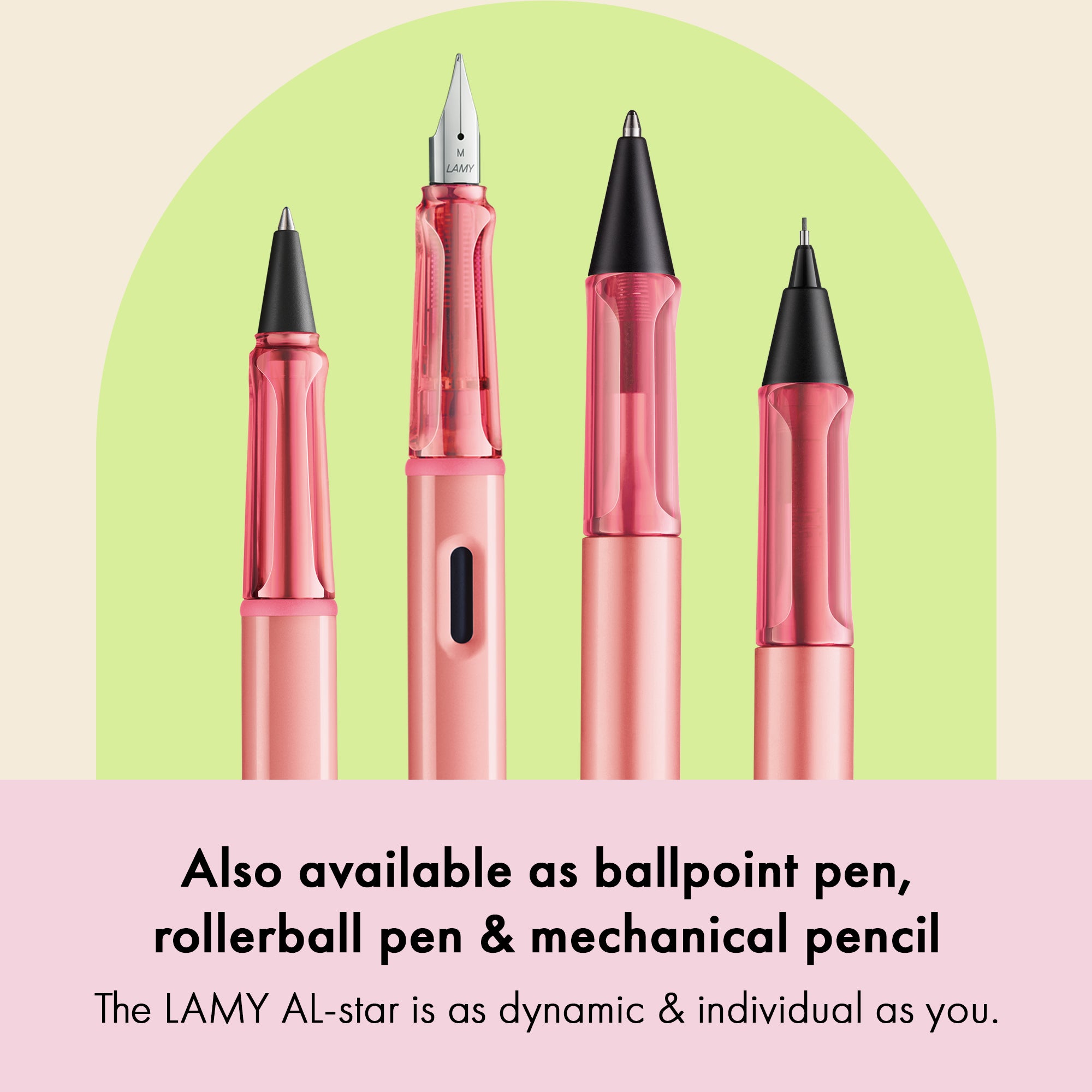 Light, lighter, LAMY AL-star: the writing classic made of resistant aluminium masters all challenges of everyday life in style. The transparent grip lies comfortably in the hand and, with an unobstructed view of the ink duct, turns the functional into a visual highlight. The series is ever inspiring with new special editions in current trendy colours and is thus an inspiring must-have in any pencil case.