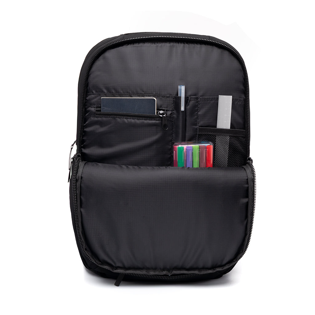 The main compartment with padded sleeve holds up to 15.6" laptops, tablets and daily essentials. The front compartment includes an organiser for small accessories. It features two quick-access zipped pockets, one on the top and one on the front.