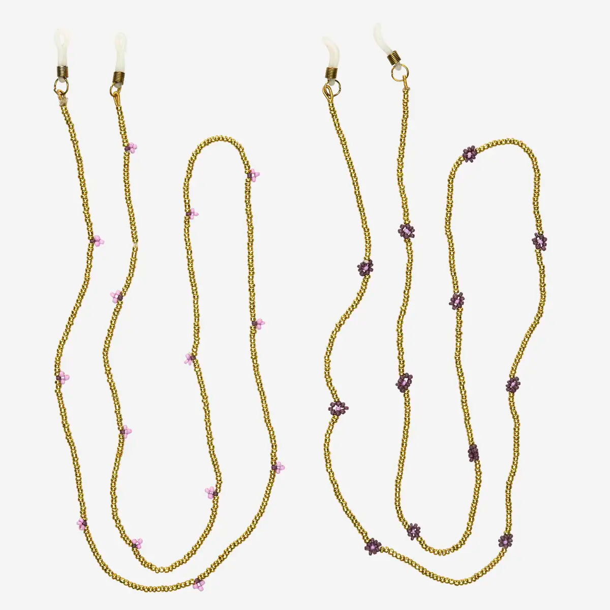 Delicate and practical, this beaded eyeglass chain features glass beads on nylon string in gold, purple and pastel lilac with discreet all-over flowers. Ideal both as decoration and to keep your glasses secure. Created with Nai Disha for Madam Stoltz, it makes a conscious, socially responsible purchase.