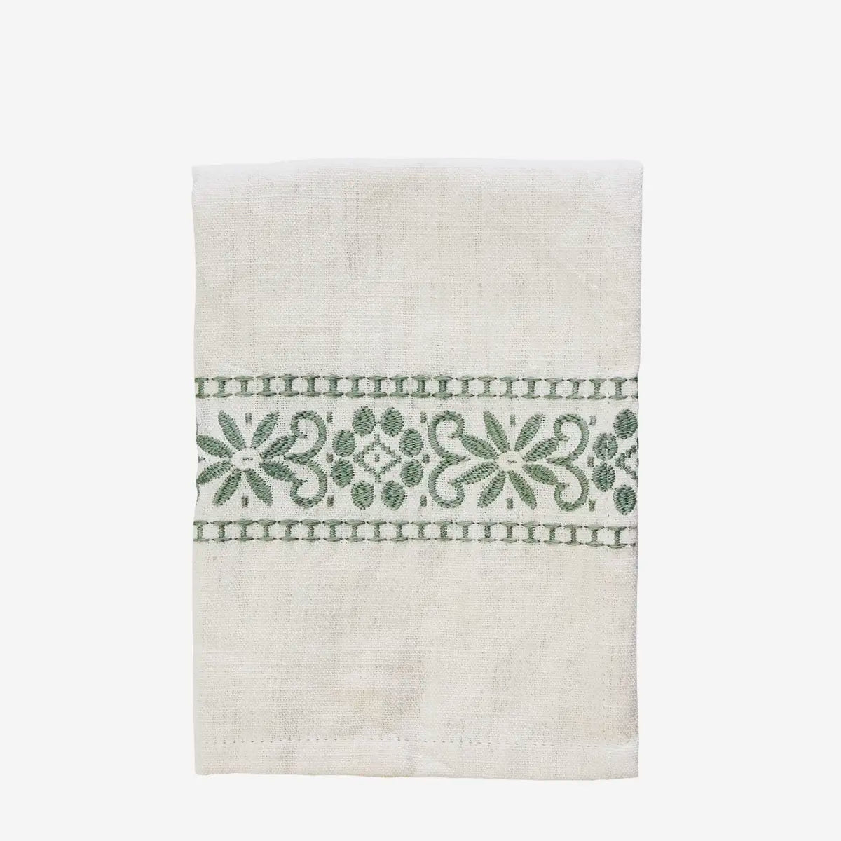 This embroidered kitchen towel, crafted from durable woven cotton, adds traditional charm and exquisite craftsmanship to your kitchen. Made in India, it comes in off white and light green, allowing you to mix and match to suit your style.