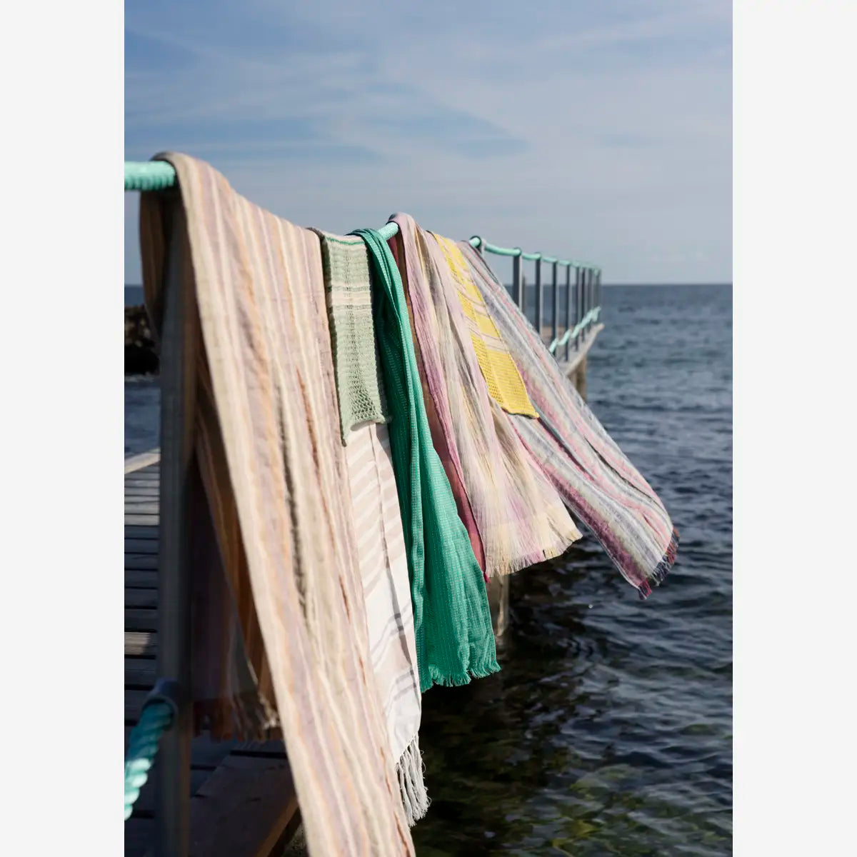 Woven from pure cotton, this striped hammam towel is lightweight and quick-drying. We recommend that you soak the towel in cold water for 24 hours and then wash it at 60 degrees before use. This opens up the cotton fibres and increases absorbency. Crafted in India, it balances practicality with a soft handfeel that becomes better with every wash. The multi coloured stripes are carefully arranged to create a subtle rhythm of tones, making this striped hammam towel as decorative on a sun lounger as it is on a bathroom hook.