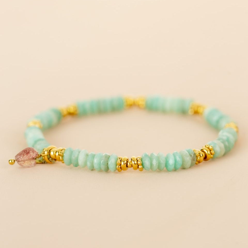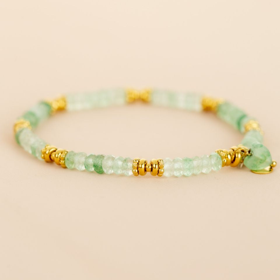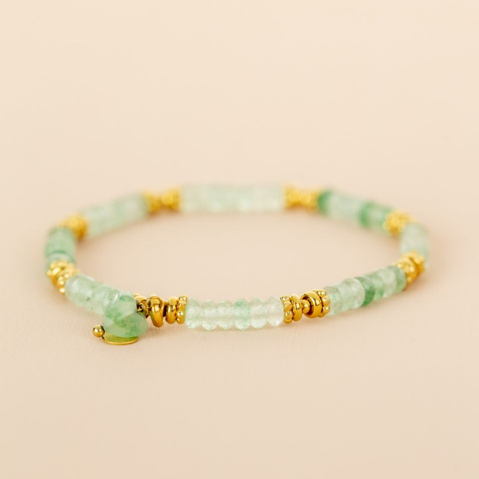 Bracelet with oval beads, a stone heart and gold beads. Gold plated stainless steel.