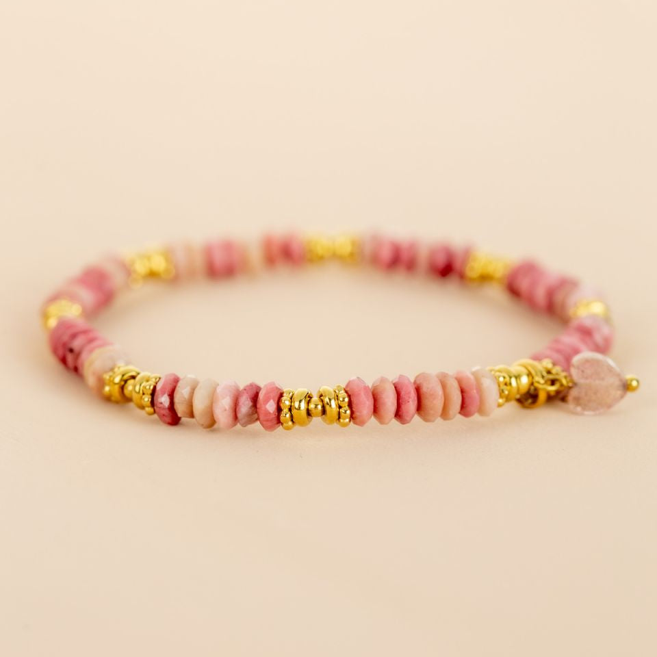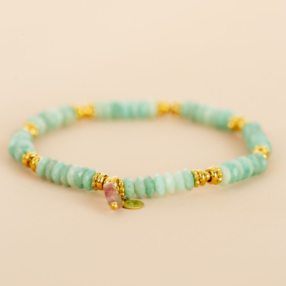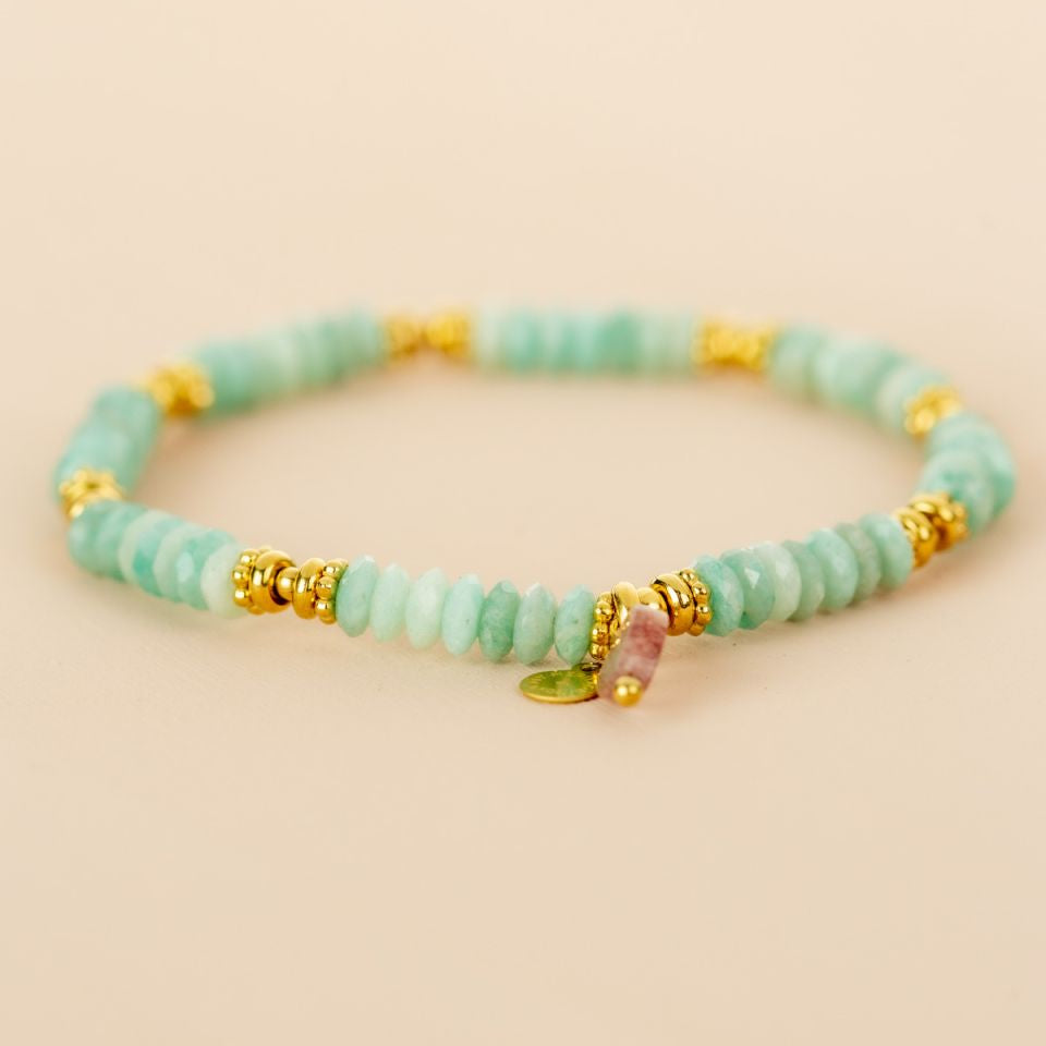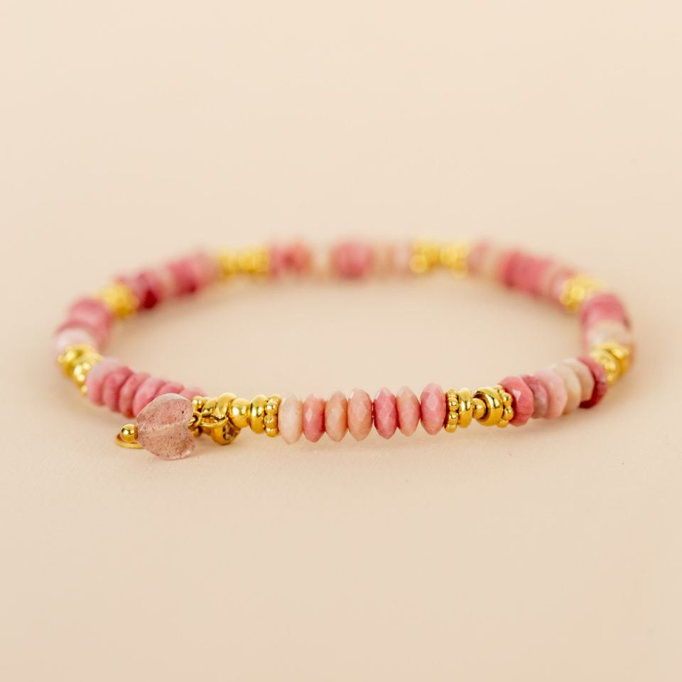 Bracelet with oval beads, a stone heart and gold beads. Gold plated stainless steel.