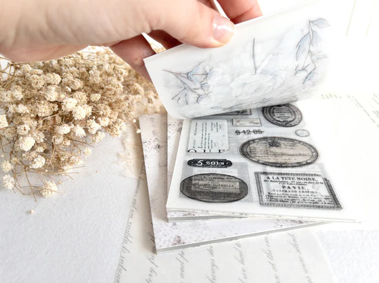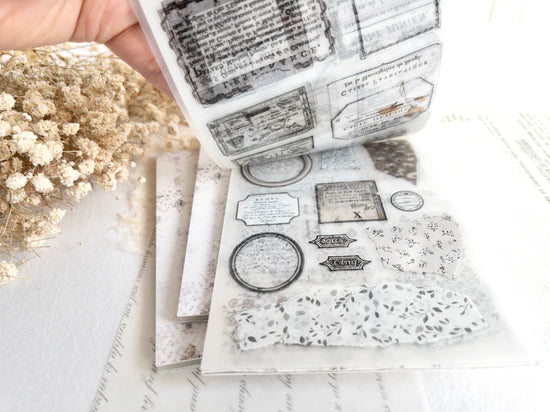 Content: 16 PET material pages with a variety of pre-cut sticker (each page different) + 6 pages washi sticker dashboards (uncut).