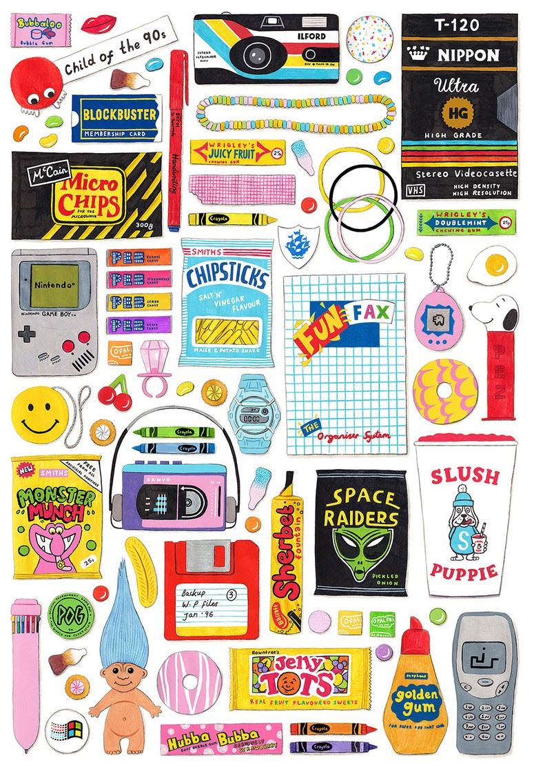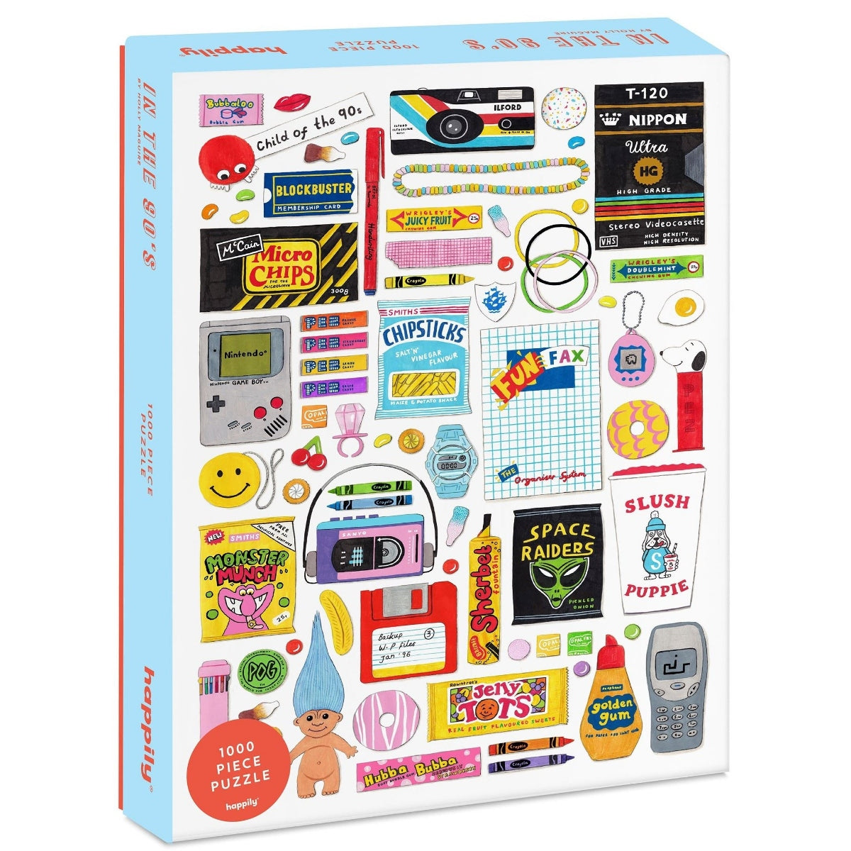 A 1,000 piece contemporary puzzle featuring illustrations of iconic products from the 1990s by Holly Maguire.