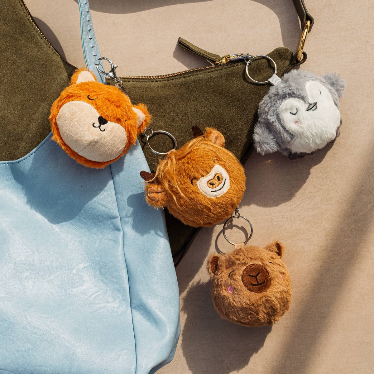 Flossie Highland Cow Stress Ball Bag Charm is a fun, squeezable accessory shaped like a Highland cow. Perfect for relieving stress and adding a whimsical touch to your bag or backpack.