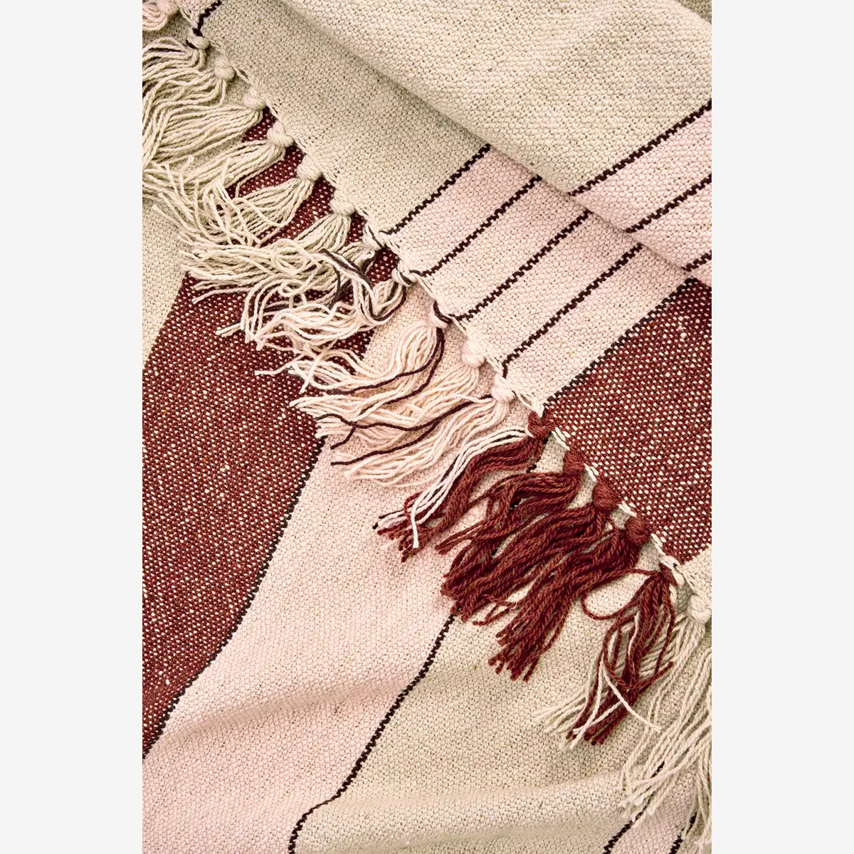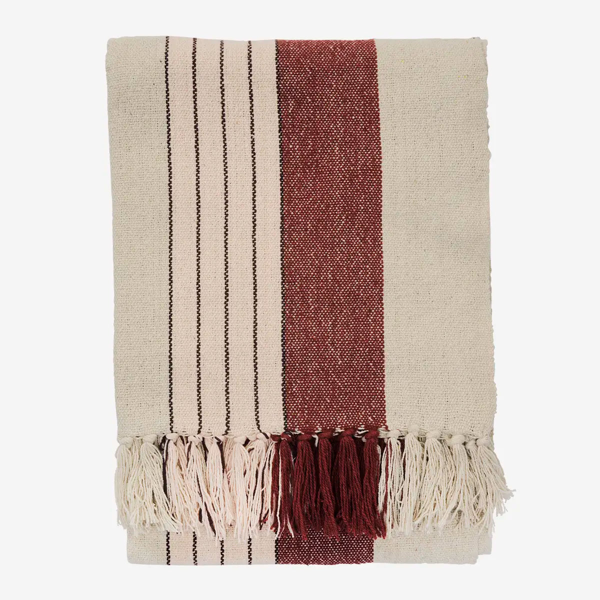 Within this recycled cotton throw, 75% recycled cotton and 25% cotton are carefully blended for a light yet cosy feel. Partly made from recycled cotton sourced from discarded clothing, it supports resource-saving production and gives existing fibres a new life. Each piece is handwoven, so slight variations tell a quiet story of the hands that made it. The off white base is lifted by almond, light pink and black details, creating a gentle contrast that still feels understated. Drape this recycled cotton throw across a neutral sofa, layer it with your favourite cushions or fold it neatly at the foot of the bed for everyday warmth.