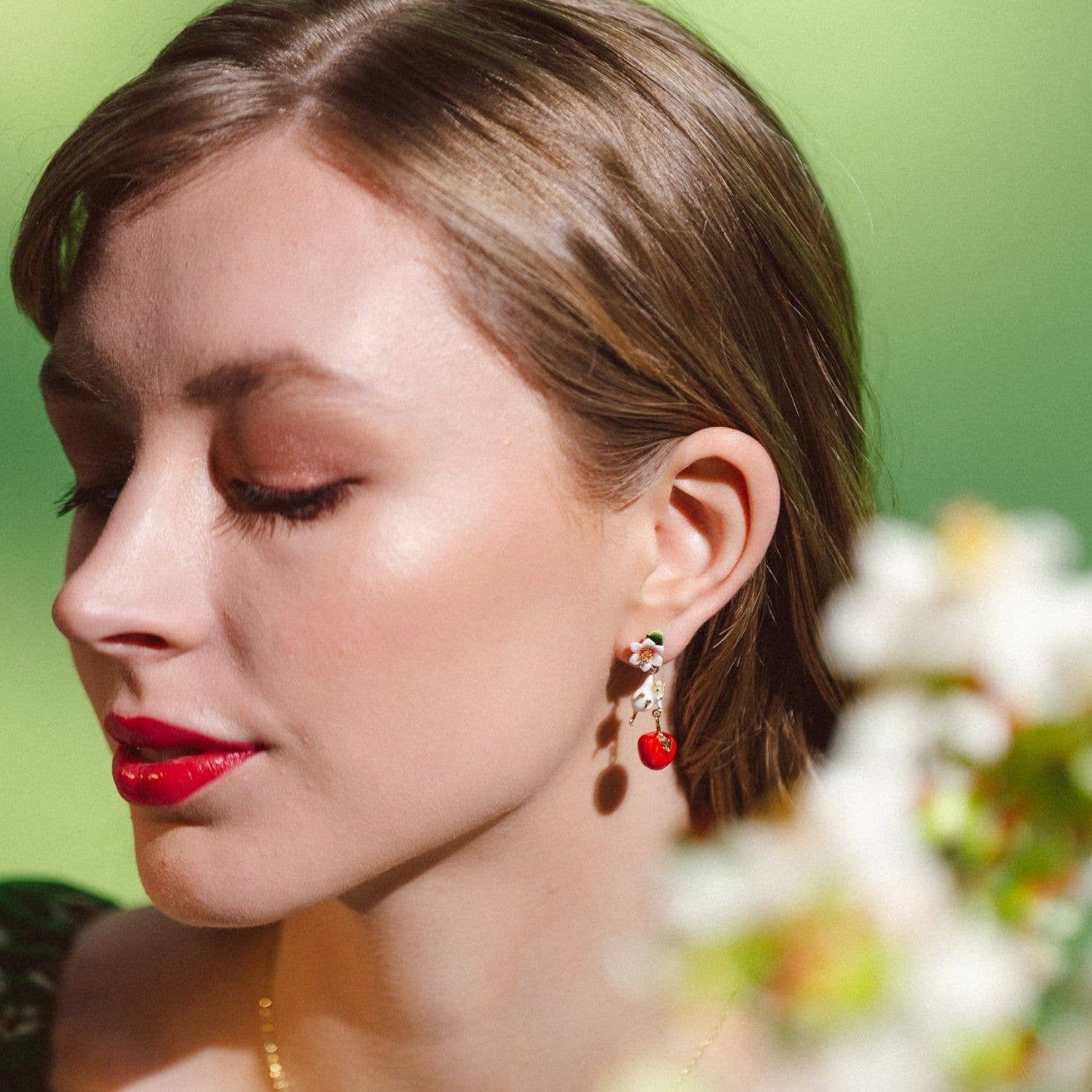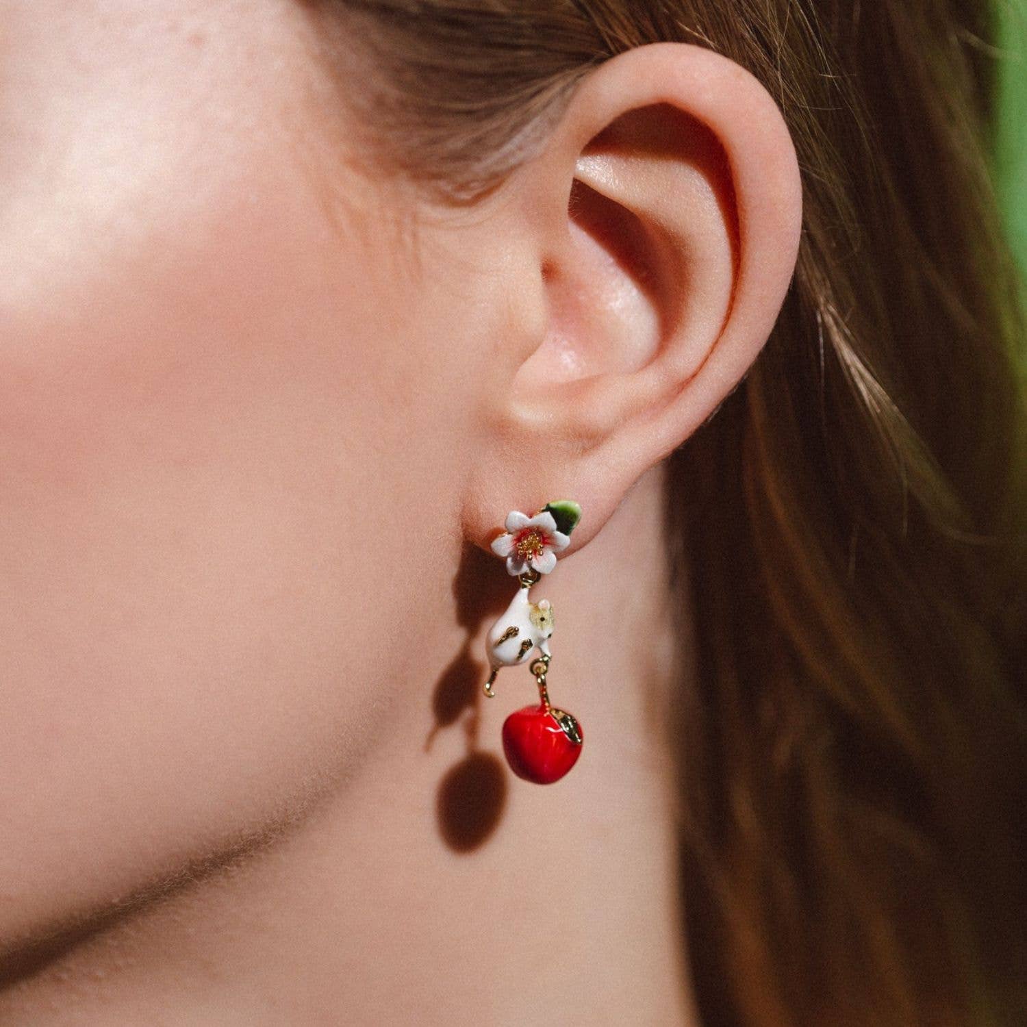 Embrace the playful charm of nature with these captivating drop earrings, from the creator of the Blackberry Mouse, Bill Skinner. Each earring features a delicate apple blossom with a curious little mouse that peeks out adding a touch of whimsical charm to this enchanting design. A juicy red apple dangles playfully below, completing this delightful scene. These earrings aren't just accessories; they're a wearable story, a touch of nature's playful magic, and a conversation starter that's sure to bring a smile. Whether you're drawn to their whimsical charm, captivated by their intricate details, or simply seeking a piece that exudes both sweetness and style, these apple blossom and mouse drop earrings will add a touch of wonder to your collection.