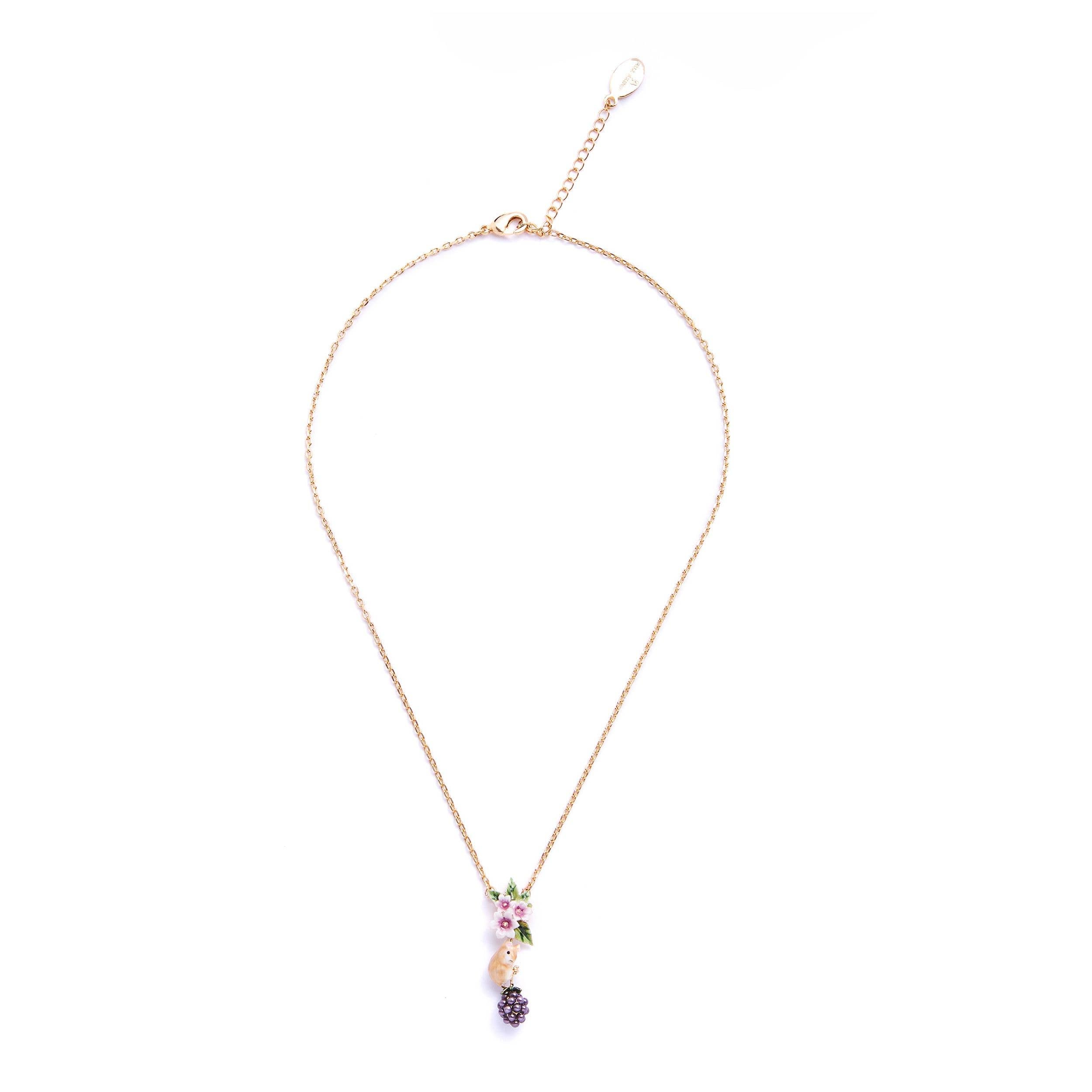 From Bill Skinner Jewellery, behold this adorable pendant starring a charming field mouse on a pearlized blackberry, beneath a trio of intricately hand-painted enamel flowers. Suspended on an 18ct gold-plated chain, this small pendant adds heaps of character to your look. Coordinate effortlessly with matching pieces from the Blackberry & Mouse Collection.