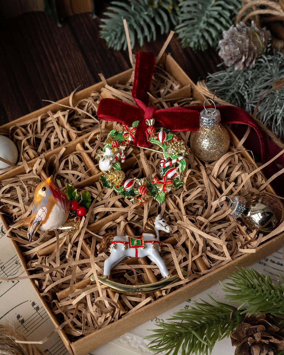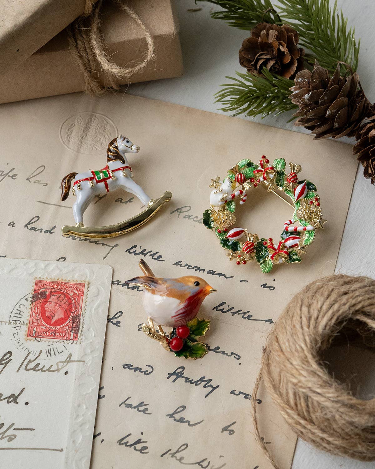 Step into a miniature winter wonderland with this enchanting Christmas mouse wreath brooch, a celebration of the festive season. This intricately crafted wreath is adorned with vibrant hand-painted green leaves and rich red berries, intertwined with gleaming gold-plated pinecones and sweet, candy-striped delights. A charming little mouse peeks out, adding a whimsical touch to this festive scene. Perfect for brightening any outfit, this brooch brings a heartwarming story and a sprinkle of holiday magic wherever you go.