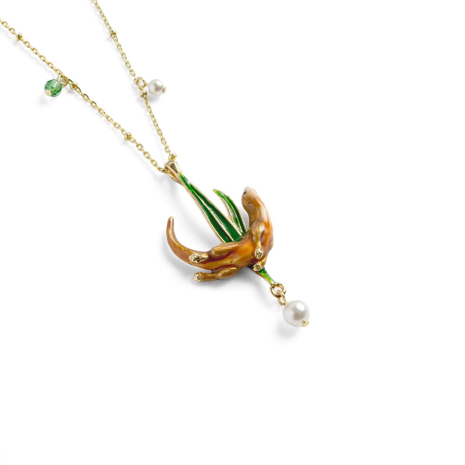 Carry a piece of the countryside with you with this captivating otter pendant necklace. A beautifully detailed gold-plated otter, brought to life with rich, hand-painted enamel in vibrant russet, gold, and green tones. This exquisite pendant hangs from a 40cm chain, securing with a lobster clasp, offering a touch of nature's elegance to your look.