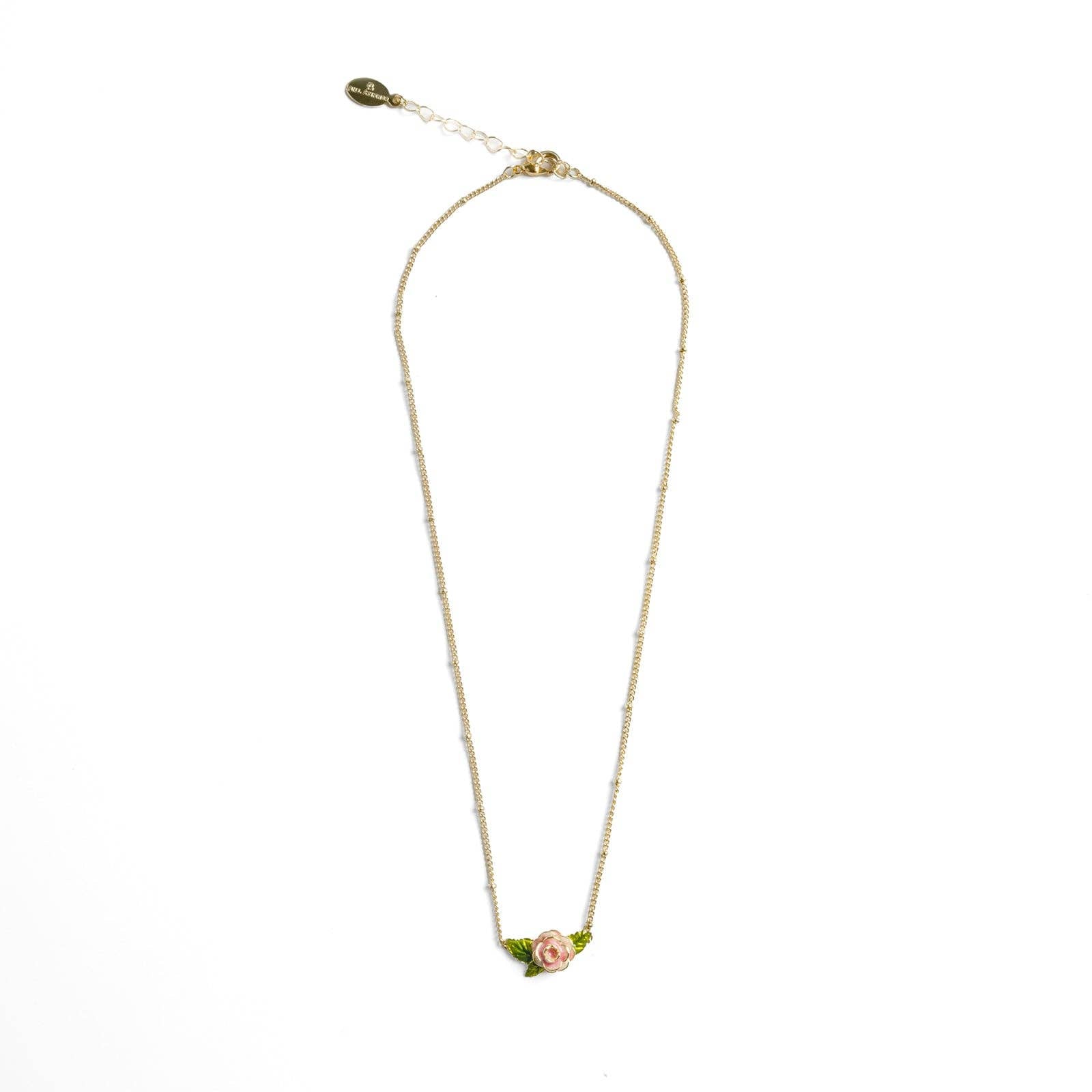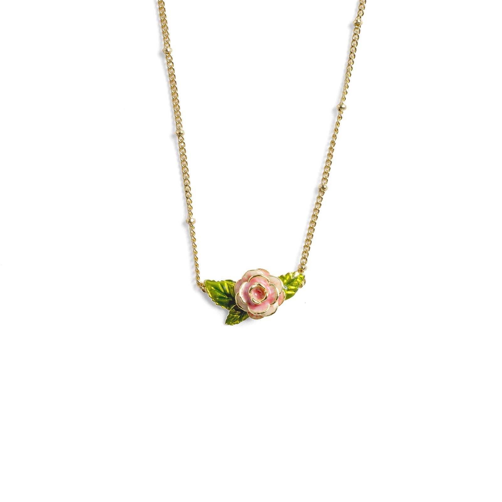 Step into an english garden with this enchanting Vintage Rose necklace, a delicate ode to classic romance. A beautifully sculpted rose, adorned with soft pink petals and vibrant green leaves in hand-painted enamel, unfurls gracefully on a gold-plated chain.