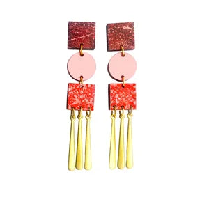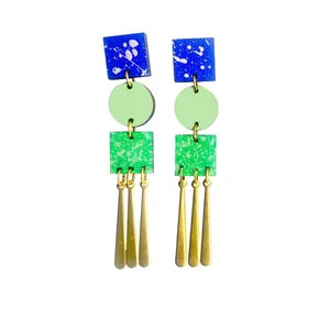 Handpainted spattered wood and mini brass teardrops with stainless steel posts.
