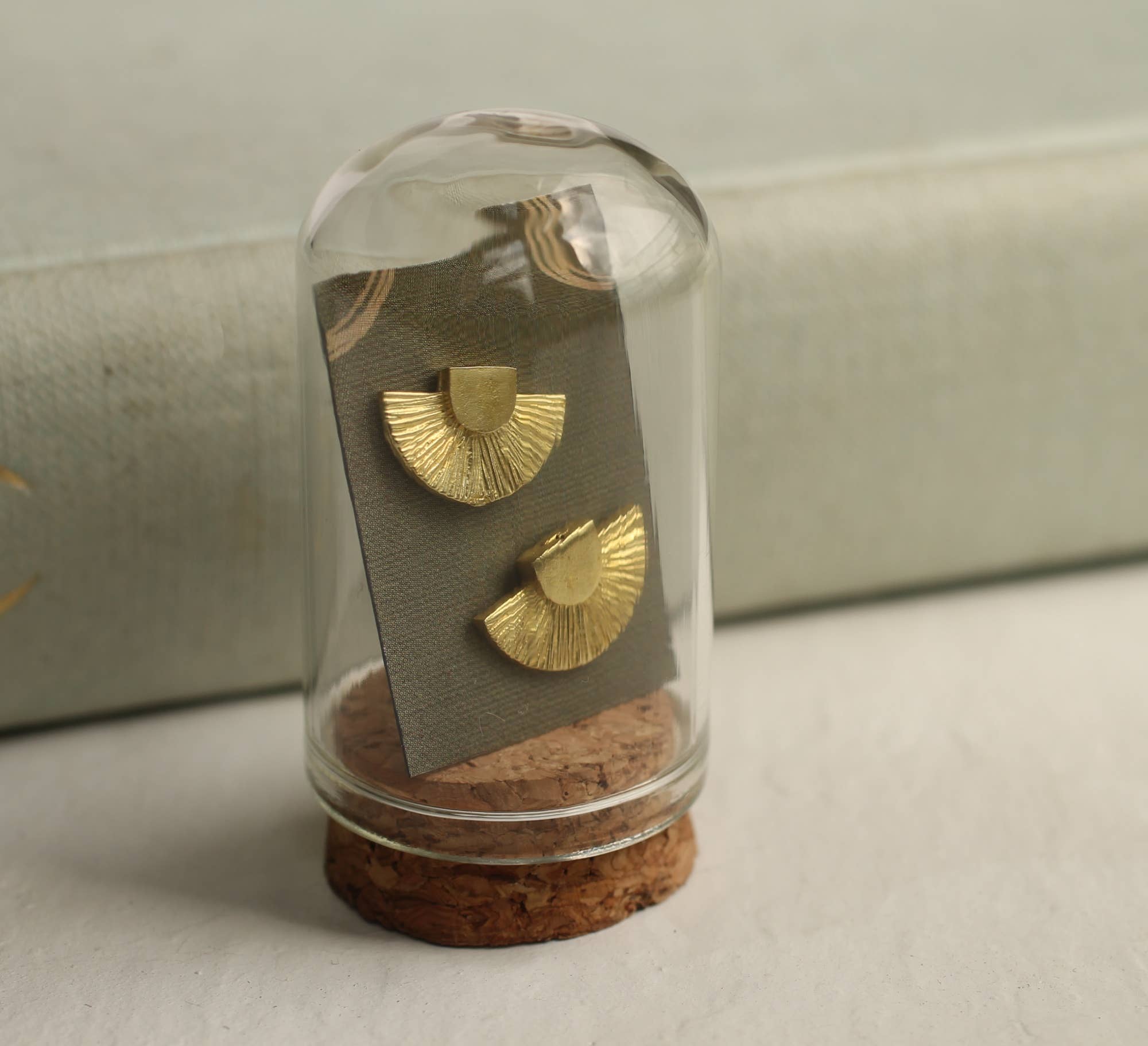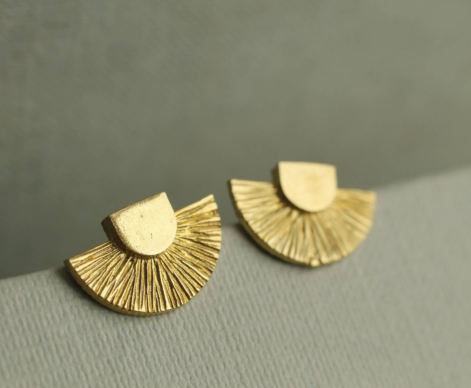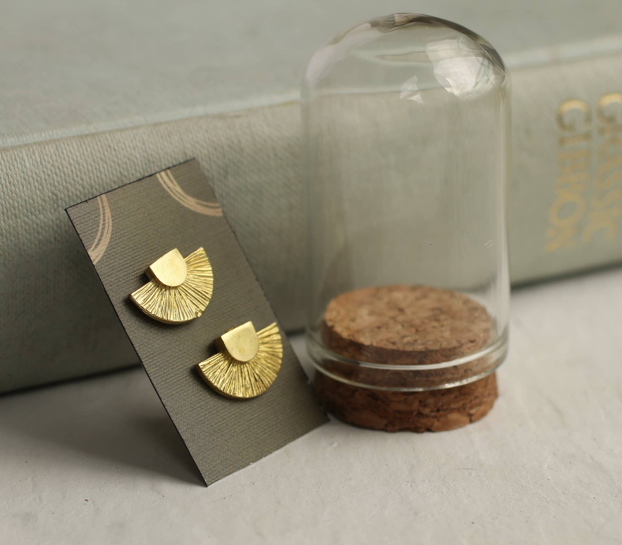 These beautiful gold stud earrings feature a geometric, stylised art deco design in solid brass. They measure 20mm across. These stud earrings come mounted on a linen presentation card.