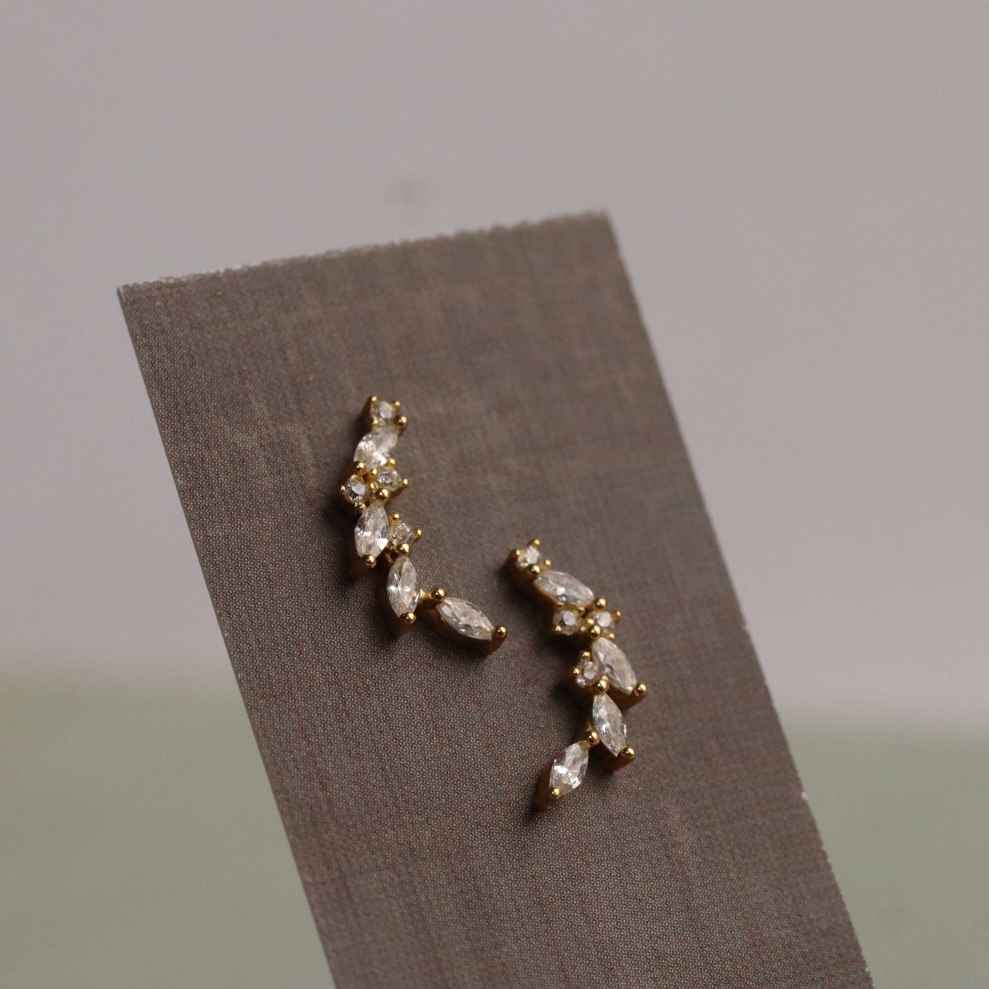 These charming and unusual stud earrings feature a miniature laurel leaf design, with cubic zirconia crystals formed to create a fluid, Art Nouveau inspired design. The earring posts and butterfly backs are 925 sterling silver. These stud earrings come mounted on a linen presentation card.