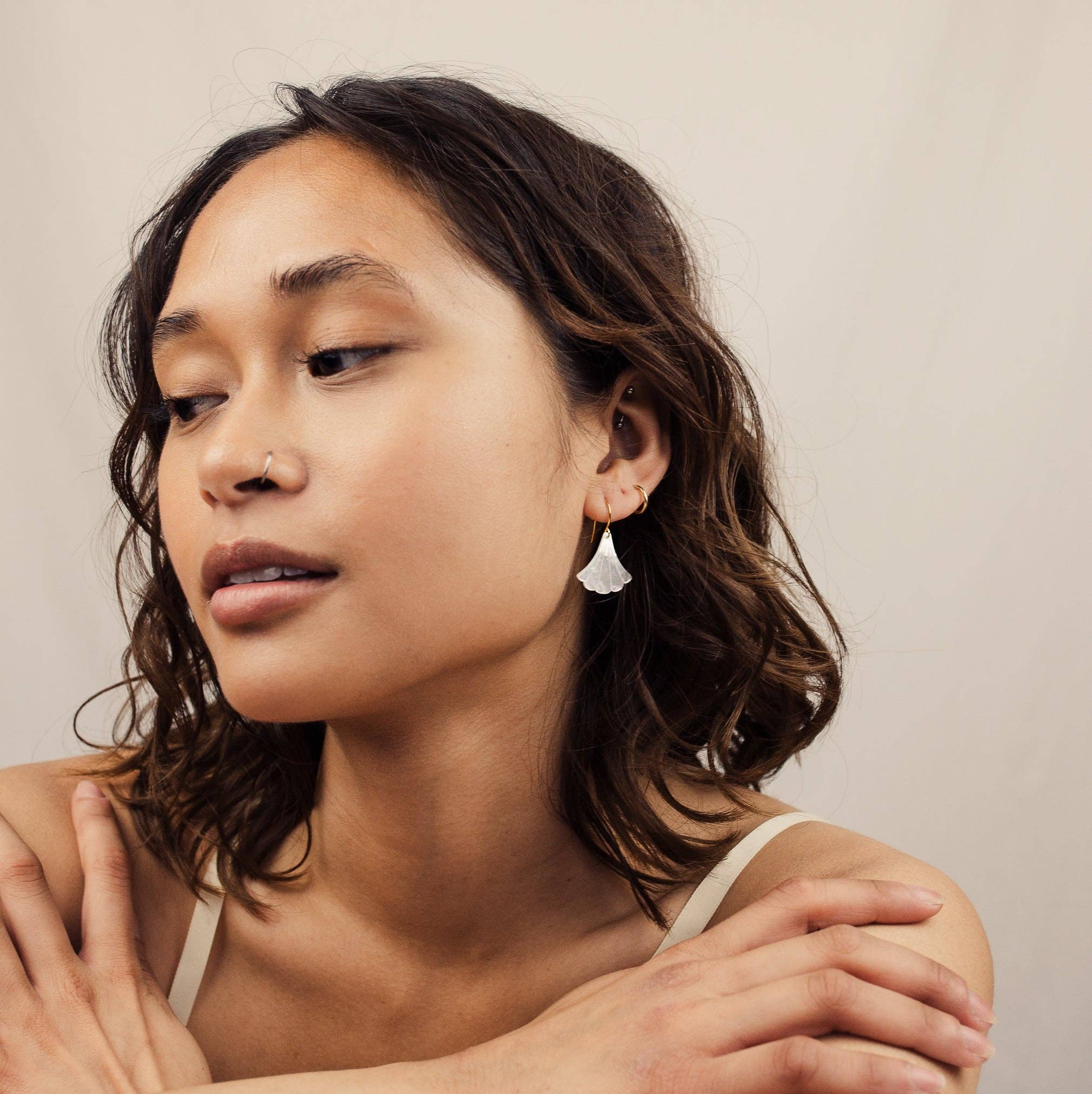 These beautiful Art Deco earrings are pure Mother of Pearl which has been carved into a simple scalloped fan shape. The pearl has an incredible sheen and take on a subtle glow when they catch the light.