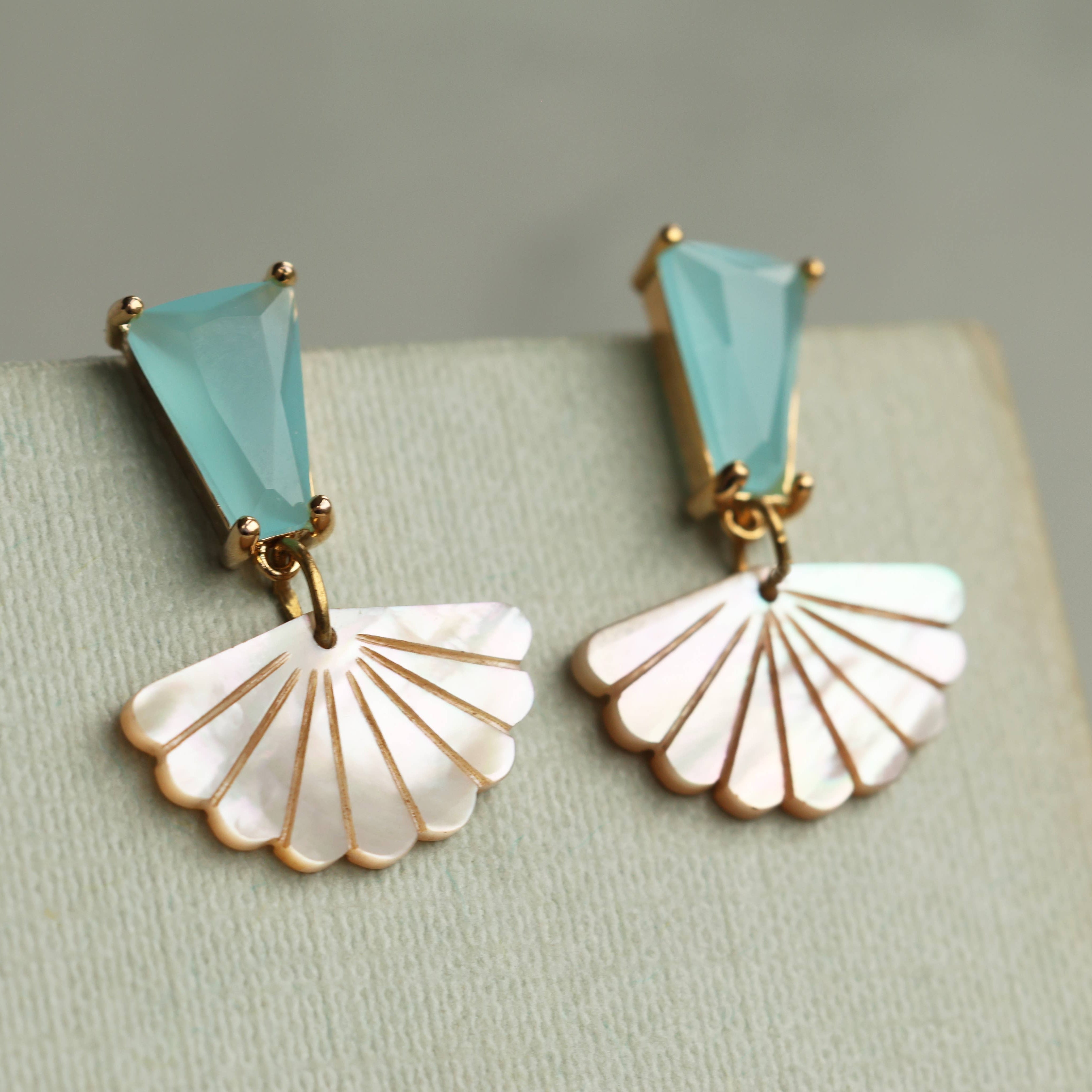 These beautifully detailed art deco earrings feature a stylised geometric turquoise opal glass with a carved scallop shape made of mother of pearl. The pearl has a very subtle iridescent colour, which takes on an amazing, beautiful sheen in certain lights. The drop and settings are gold plated brass. The earrings have a post fastening with butterfly backs. The length of these earrings is around an inch and a half (35mm) with the pearl designed to sit around an inch below the earlobe.